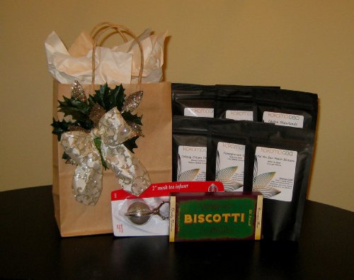 There's nothing better than the taste of a warm cup of tea to bring you some holiday cheer. Included in this gourmet loose tea gift bag set are six 2oz packages of loose tea to make this holiday season your merriest yet! With delicious flavors like Pomegranate Green, 8th & Ocean, Paii Mu Dan Peach Blossom, Oolong Cream Caramel, Ceylon "Shawlands", Masala Chai, your only problem will be making sure you have enough to share once everyone catches a sniff of the wonderful aromas. Also included is this adorable set is a stainless steal tea infuser and a delicious 2pk of all natural chocolate biscotti. Everything comes wrapped in a beautiful, handmade holiday gift bag, making this a lovely holiday gift for anyone to receive. Each 2oz package will make 25-30 cups of tea if the tea is steeped just once. All six packages will make at least 150-180 cups of tea. To make the most out of your tea, continue to steep the leaves until they have lost their flavor before adding a new scoop of tea. To make things as easy as possible, each tea will come with its own steeping guide on the label.